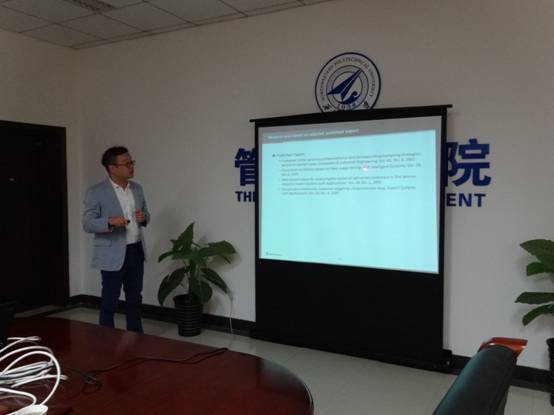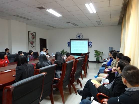 At the beginning of the report, associate Professor Wang Keqin introduced the main study and career experience.Next, Professor Pei described his academic research and project experience.His research includes the WEB usage mining,demand classification and type analysisof customer, customer identification through the Map of Customer, etc. He also shared his own project experience, including research results in product technology integration index system,knowledge management system platform of the basic product technology, manufacturing execution system and factory energy management system.