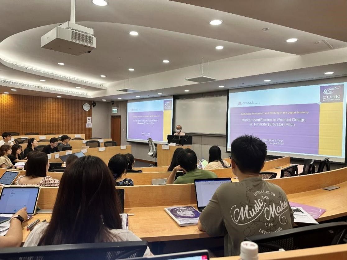 香港中文大学营销领域专家容永笙老师为同学们介绍了“Elevator Pitch”的含义和要素,使同学们对现代营销手段有了比较深刻的了解。之后,老师引入“6Ws”方法教会大家如何定义一个市场,并带领同学们分析许多真实公司案例中的6Ws。容老师结合日常生活细节讲授内容,营造了生动轻松的课堂氛围。