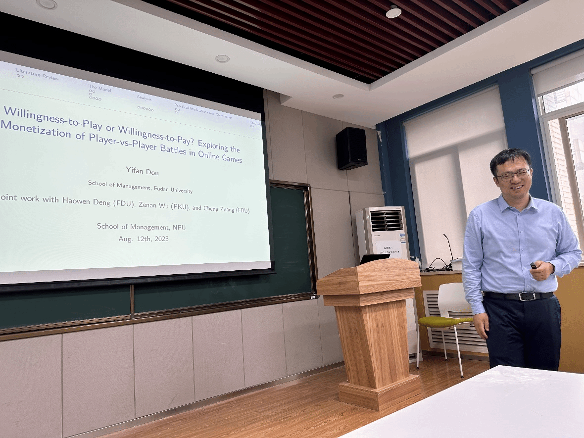 2023年8月12日上午,应williamhill英国威廉希尔邀请,复旦大学williamhill英国威廉希尔窦一凡教授在长安校区williamhill英国威廉希尔作了题为 Willingness-to-Play or Willingness-to-Pay? Exploring the Monetization of Player-vs-Player Battles in Online Games 的学术报告。本次活动由信息管理系王鹏副教授主持,williamhill英国威廉希尔教师和研究生参加了报告会。