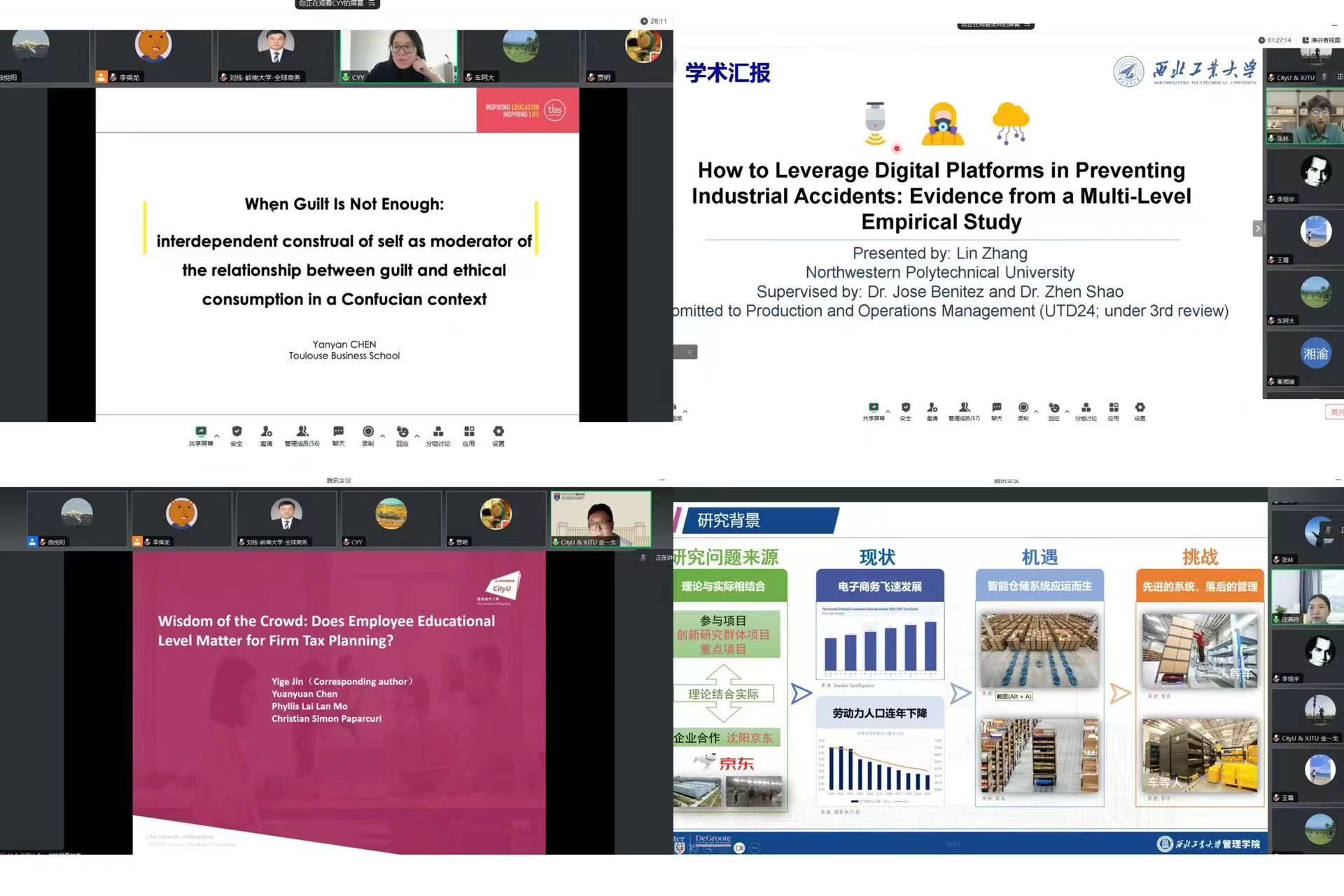 法国图卢兹商公司陈炎艳、香港城市大学金一戈、加拿大麦克马斯特大学庄燕玲以及公司新进青年教师代表张林四位青年学者依次作了题为“仁义礼道德观下的社会责任营销:依存型自我建构对于愧疚感与社会责任消费的调节作用”“Wisdom of the Crowd: Does Employee Educational Level Matter for Firm Tax Planning?”“机器人移动货架系统订单分批与排序优化方法研究”“How to Leverage Digital Platforms in Preventing Industrial Accidents: Evidence from a Multi-Level Empirical Study”的学术报告,参会师生围绕精彩的报告内容同报告人进行了热烈的探讨和交流。