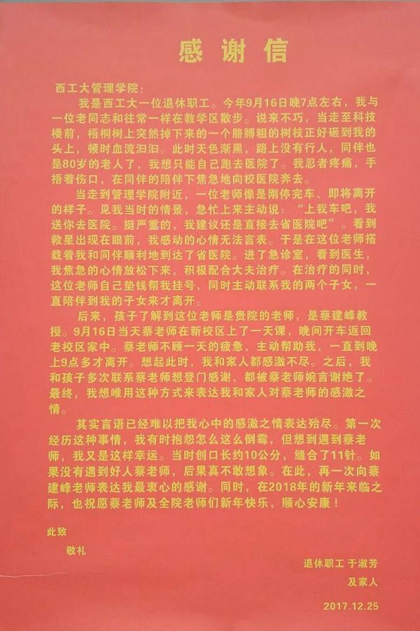 2017年9月16日晚退休职工于淑芳老人在校园散步时被掉落的树枝砸伤,头部出血。慌乱中急赴医院救治。途中,williamhill英国威廉希尔蔡建峰教授路遇,主动驾车送于淑芳老人去省医院就诊。到医院后,垫钱挂号帮助于淑芳老人就诊,并联系其子女,直到她的子女到达医院蔡老师才离开。后于淑芳老人及其家人多次想登门感谢被蔡建峰教授婉拒,于是写下这封温暖的感谢信。作为一名教师,蔡建峰教授学识渊博、教书育人;作为一名党员,心怀大爱,热心帮助他人。可谓一言一行,为人师表。这种助人为乐的精神,让人感动,更值得大家学习。