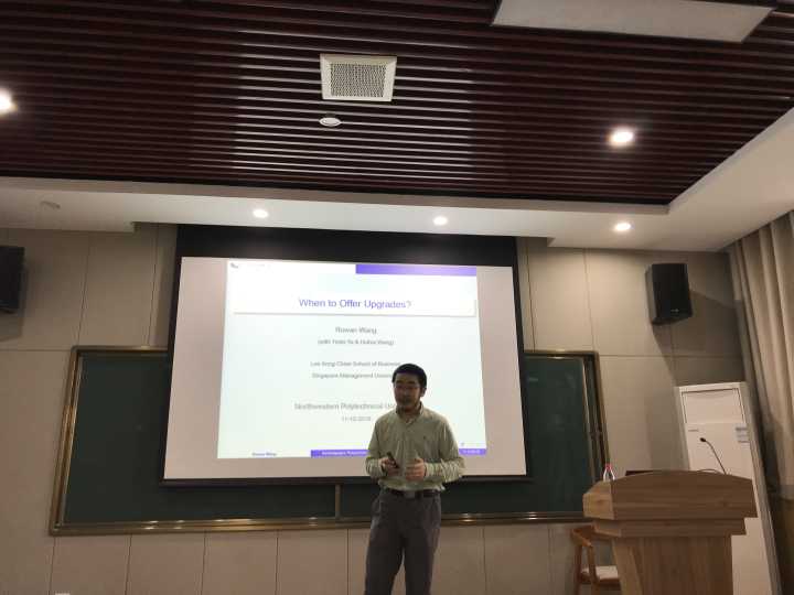10月11日上午,新加坡管理大学运营管理系助理教授王宇博士应邀前来williamhill英国威廉希尔进行学术交流,并做了题为“When to Offer Upgrades?”的报告。报告会在214报告厅举行,由李乘龙副教授主持,参加此次学术报告会的有来自williamhill英国威廉希尔的本科生和研究生。