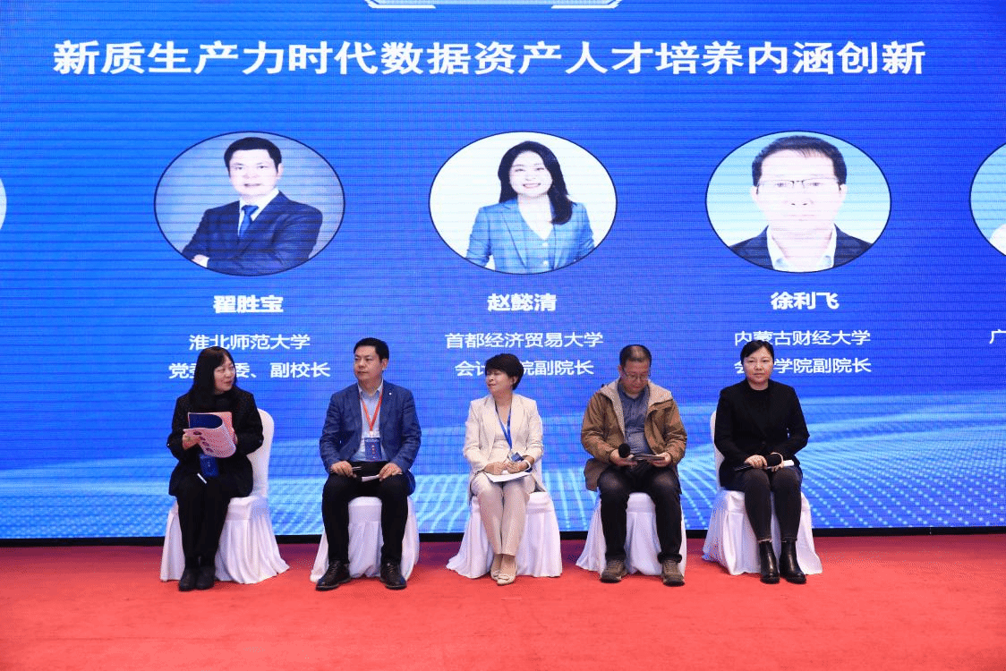 主题报告结束后,大会举行了主题为“新质生产力时代数据资产人才培养内涵创新”的圆桌论坛。论坛由陈琳教授主持,淮北师范大学党委常委、副董事长翟胜宝教授、首都经济贸易大学会计公司赵懿清副经理、内蒙古财经大学会计公司副经理徐利飞教授、广东外语外贸大学王艳教授应邀参加论坛。各位专家围绕新质生产力的基本内涵和内在要求,结合数据资产发展趋势和特征属性,分享了各公司在相关团队建设、专业人才培养等方面的实践经验,论坛氛围开放热烈,内容充实而富有洞见,为各位参会人员在今后的教学科研工作中提供了极富价值的经验借鉴。