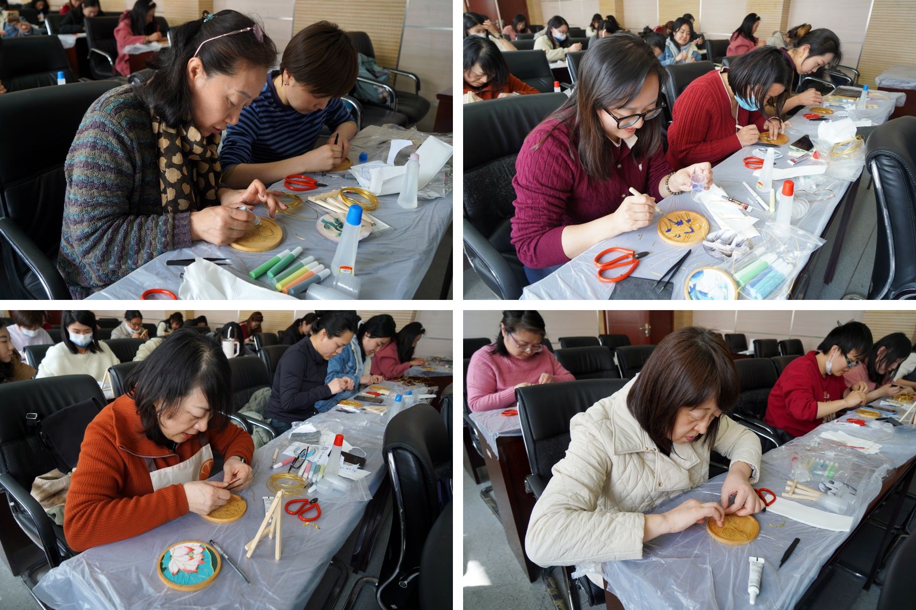 活动开始之前,张祎老师简要介绍了本次活动策划的初衷,并针对掐丝珐琅的文化内涵、制作工艺和关键操作要点等进行了详细介绍。实践过程中,在张老师的指导下,女教职工们化身“非遗匠人”,亲历掐丝珐琅制作全流程,画纹样、掐丝造型、上色.....最终,经过大家的全心投入,一个个精致美观的掐丝珐琅杯垫作品纷纷亮相,引发大家的阵阵赞叹。