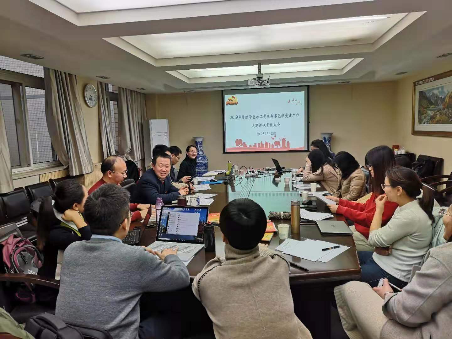 为深入学习贯彻习近平新时代中国特色社会主义思想和党的十九大精神,全面落实管党治党政治责任,进一步推动全面从严治党向基层延伸,12月25日下午,在友谊校区williamhill英国威廉希尔楼308会议室,管理公司党委召开了2019年度教职工党支部书记抓党建工作述职评议大会。公司班子成员、工会副主席、系主任及系主任助理代表、教师代表共计11人担任评委。会议由公司党委书记李小聪主持。