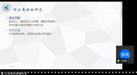 分享会伊始,王清亮博士以刚被国际顶级期刊(UTD-24,FT50,ABS4*)Marketing Science录用的一篇论文为例,介绍了自己如何寻找研究问题,研究的思路和方法,以及理论贡献等。之后,王清亮博士围绕什么是好的研究,如何做好的研究以及论文的写作与发表三个方面分享了自身的经验和心得体会。他认为好研究的起点是一个好的研究问题,并建议了两种寻找研究问题的方法。第一种方法是从理论的角度出发,通过阅读文献,寻找前人理论的局限性,或者文献中聚焦悬而未决有争论的问题。第二种方法是基于实践中难以解决的管理问题,思考前人理论的局限性。关于研究问题是否需要追热点,他认为这不是必须的,重点在于如何透过“热点的现象”看“理论的本质”,从理论层面思考热点问题的价值。在分享会最后的提问环节,王清亮详细回答了老师和同学们的问题,例如,如何收集数据、如何选择研究方法、提高英文论文阅读水平等。