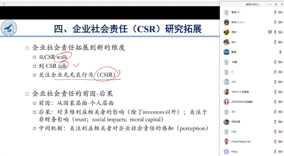 《管理理论专题》是公司为博士生开设的前沿课程,由公司10多位教师来集体授课,每位教师介绍自己所在领域的研究情况。本学期则借网络授课的契机,尝试将授课与学术报告结合,改为公开讲座形式。计划未来每周安排两次报告,持续两个月左右的时间。本次讲座也是该系列报告的第一讲,公司贾明教授通过腾讯会议平台分享了有关企业社会责任研究的回顾与展望。报告会中,有来自各公司的本科生、硕士生、博士生以及教师一共109人参加了此次线上学术讲座。