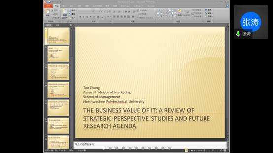 4月23日下午,公司举行了《管理理论专题》系列报告第七讲。张涛副教授通过腾讯会议平台做了主题为“信息技术的商业价值:基于战略视角的研究回顾与未来研究方向”的报告。多位老师和修读博士生课程的博士生参与了本次线上学术讲座。