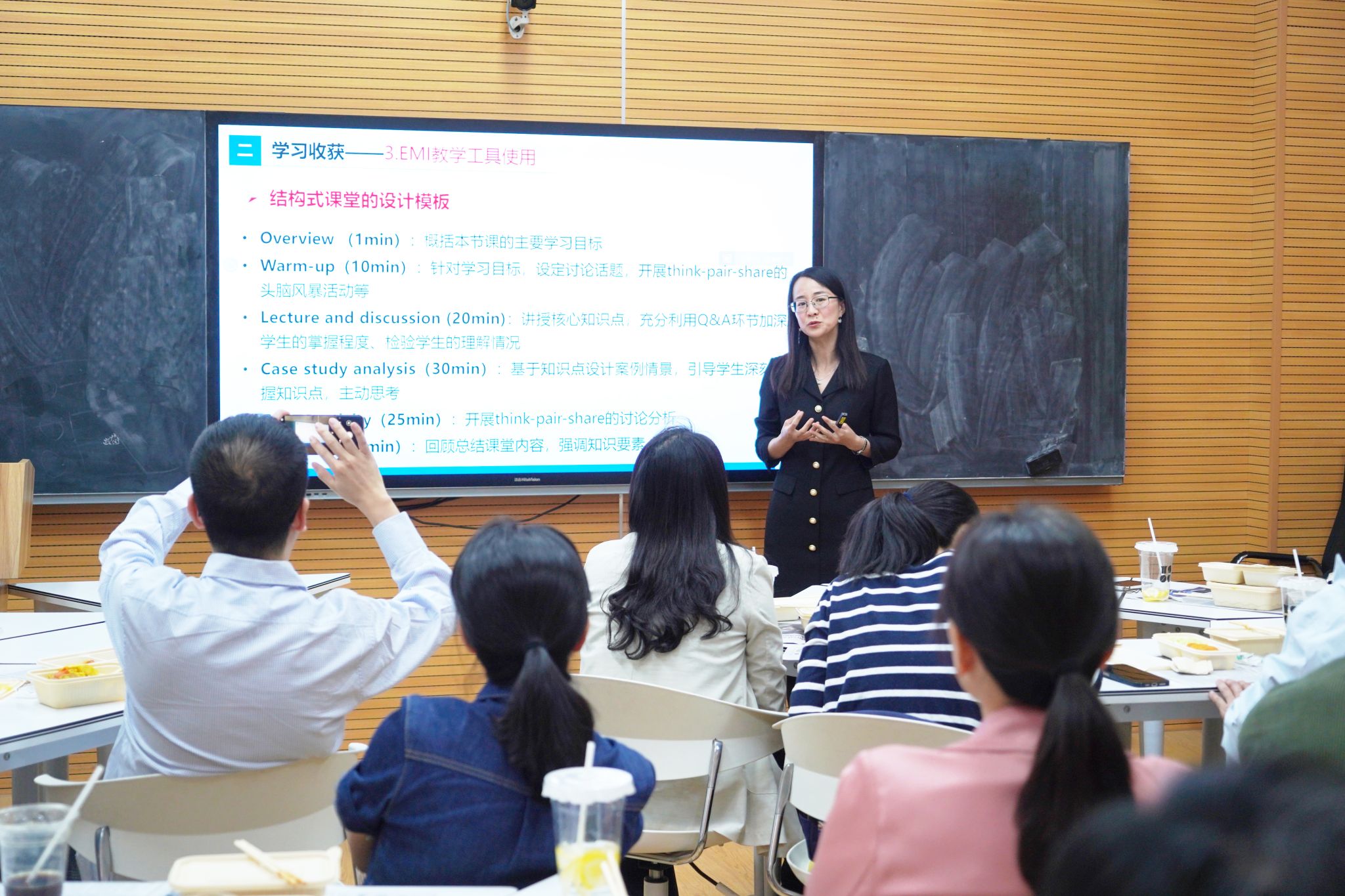 董雪艳副教授在报告中介绍了EMI教学工具的使用方法。围绕结构式课堂设计、互动教学工具应用及AI技术与课程深度融合等关键维度,同与会教师全面分享了教学研修的成果。在分享中,她谈到EMI教学法主讲教师通过现场实践督导与即时高效反馈相结合的方式,深入解析教学技巧的实践应用,使此次参训教师受益颇深。她表示,此次教学研修项目不仅深切感受到公司对青年教师教学能力提升的支持及参训教师群体对公司产品的热忱,更从中汲取了丰富的跨文化、跨学科教学经验与创新灵感。作为教学改革践行者,她将持续推进EMI教学理念与课程体系融合,在教学范式转型、育人理念革新及课堂效能提升方面深入展开探索与实践。