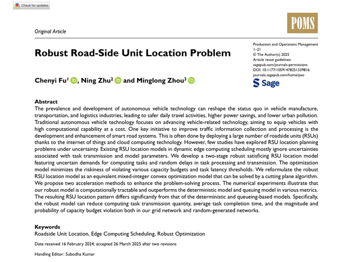 近日,williamhill英国威廉希尔教授傅陈翼以第一作者在《Production and Operations Management》期刊上在线刊登题为“Robust Road-Side Unit Location Problem”的研究成果。合作者包括中国科学技术大学朱宁教授和复旦大学周明龙副教授。《Production and Operations Management》是运营管理领域顶级期刊,是美国University of Texas at Dallas所选出的商公司最顶尖24种学术期刊(简称UTD24)之一。