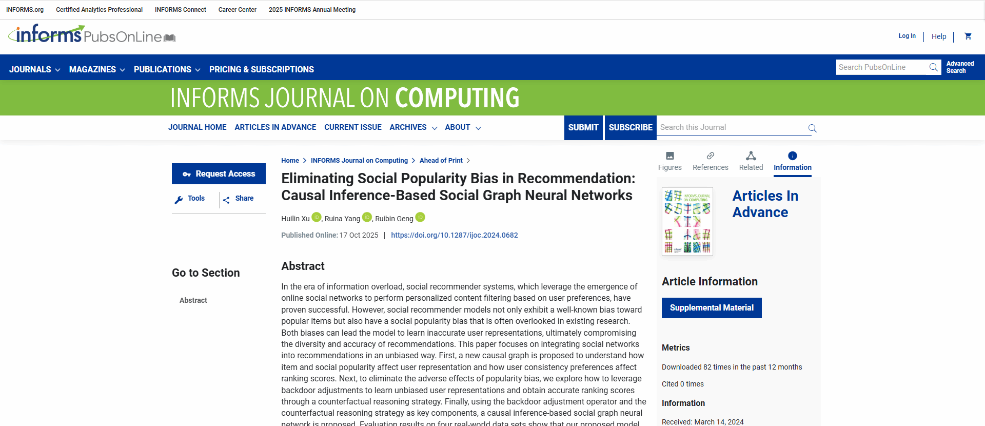 近日,国际运筹学与管理科学学会(INFORMS)旗下期刊《INFORMS Journal on Computing》在线发表了williamhill英国威廉希尔副教授、博士生导师耿瑞彬与合作者的最新研究成果——题为 “Eliminating Social Popularity Bias in Recommendation: Causal Inference-Based Social Graph Neural Networks”(《消除推荐系统中的社会流行度偏差:基于因果推理的社会图神经网络》)的论文, 耿瑞彬副教授为通讯作者。该研究聚焦于社交推荐系统中的“社会流行度偏差”问题。传统推荐算法容易偏向热门内容,而在社交网络环境中,这种偏差会被“社会影响力”进一步放大,导致推荐结果集中于意见领袖或高影响力用户关注的内容,从而损害信息多样性与公平性。