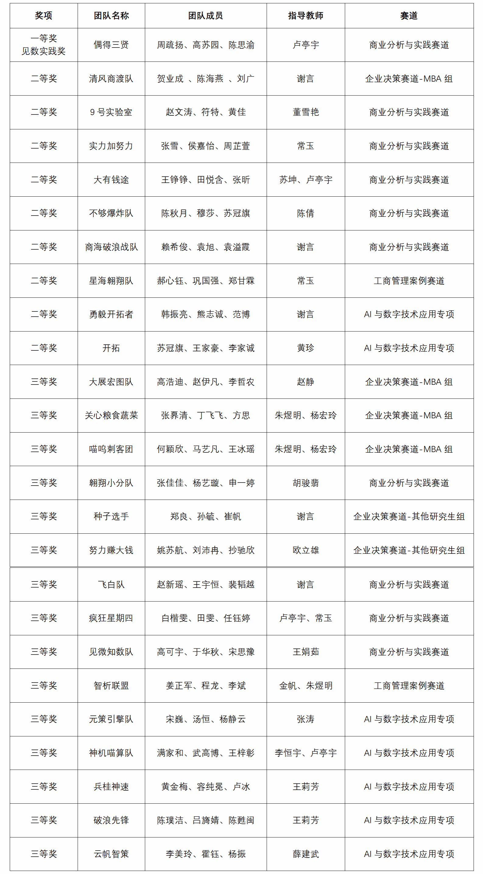 本届大赛聚焦数智时代企业管理核心挑战,设企业决策赛道,商业分析与实践赛道,工商管理案例赛道和AI与数字技术应用专项赛道,对参赛团队的理论应用、数据洞察与解决方案落地能力提出了更高要求。公司在各赛道均展现强劲竞争力,实现“多点开花”。商业分析与实践赛道不仅斩获全国一等奖1项、二等奖5项、三等奖4项,更凭借“偶得三贤”团队的出色实践应用成果,赢得命题企业高度评价,成功拿下该赛道最高荣誉“见数实践奖”,团队指导老师卢亭宇亦获评“优秀指导老师奖”。企业决策赛道收获二等奖1项、三等奖5项;工商管理案例与数字技术赛道获二等奖和三等奖各1项;AI与数字技术应用专项赛道获二等奖2项、三等奖5项。