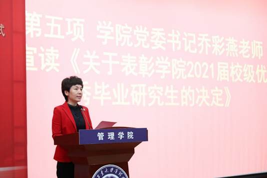 公司党委书记乔彩燕老师宣读了《关于表彰2021届校级优秀毕业研究生的决定》,她希望被表彰的优秀毕业生珍惜荣誉、再接再厉,在工作岗位上继续发扬母校的优良传统,以实际行动回馈社会,为实现伟大的中国梦奉献自己的青春和才智。同时还号召在校生要以优秀毕业生为榜样,坚信理想信念,勤奋学习,努力成长为高素质人才。