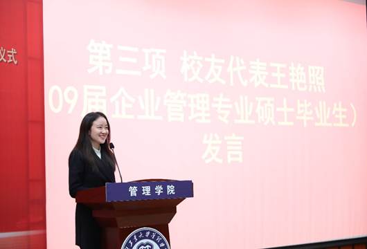 2009届企业管理专业硕士毕业生王艳照作为员工代表,对广大毕业生寄语:用积极乐观的心态正确面对挫折;坚持学习,即使走出校门也应当保持学习的态度和努力的状态;要有务实、担当、创新的职业精神;做一个心怀感恩的人,树立小我与大我。