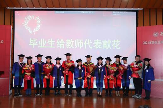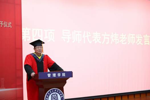 方炜老师作为导师代表,衷心感谢毕业生三年的辛勤付出,以及父母、老师的帮助与关心,并以创新意识、管理自信和终身学习三个方面为毕业生上了最后一课。师恩难忘,毕业生代表为导师代表献上鲜花表达感恩与祝福。