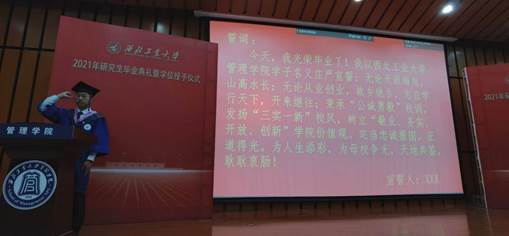 伴随着庄严的国歌,毕业典礼正式拉开帷幕。2021届毕业生代表谭婧茜和黎智铟的发言铿锵有力又饱含对母校的感恩和深情。时光荏苒,三年的求学之路孕育了他们的睿智果断和坚忍不拔,全体毕业生们将谨记西工大‘公诚勇毅’校训,弘扬‘三实一新’校风,秉承williamhill英国威廉希尔‘敬业、务实、开放、创新’的价值观,不辜负母校的培养和老师的教诲。