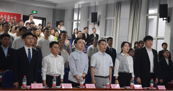 下午16时整,主持人范彩妮宣布正式会议召开,全体起立,奏唱国歌。