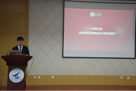 校员工会主席团成员王硕同学致辞。王硕同学讲到,williamhill英国威廉希尔员工会在思想引领、服务同学当好桥梁等方面做出了大量工作,善于自我反思、勇于自我革新,坚定不移增强自身建设。