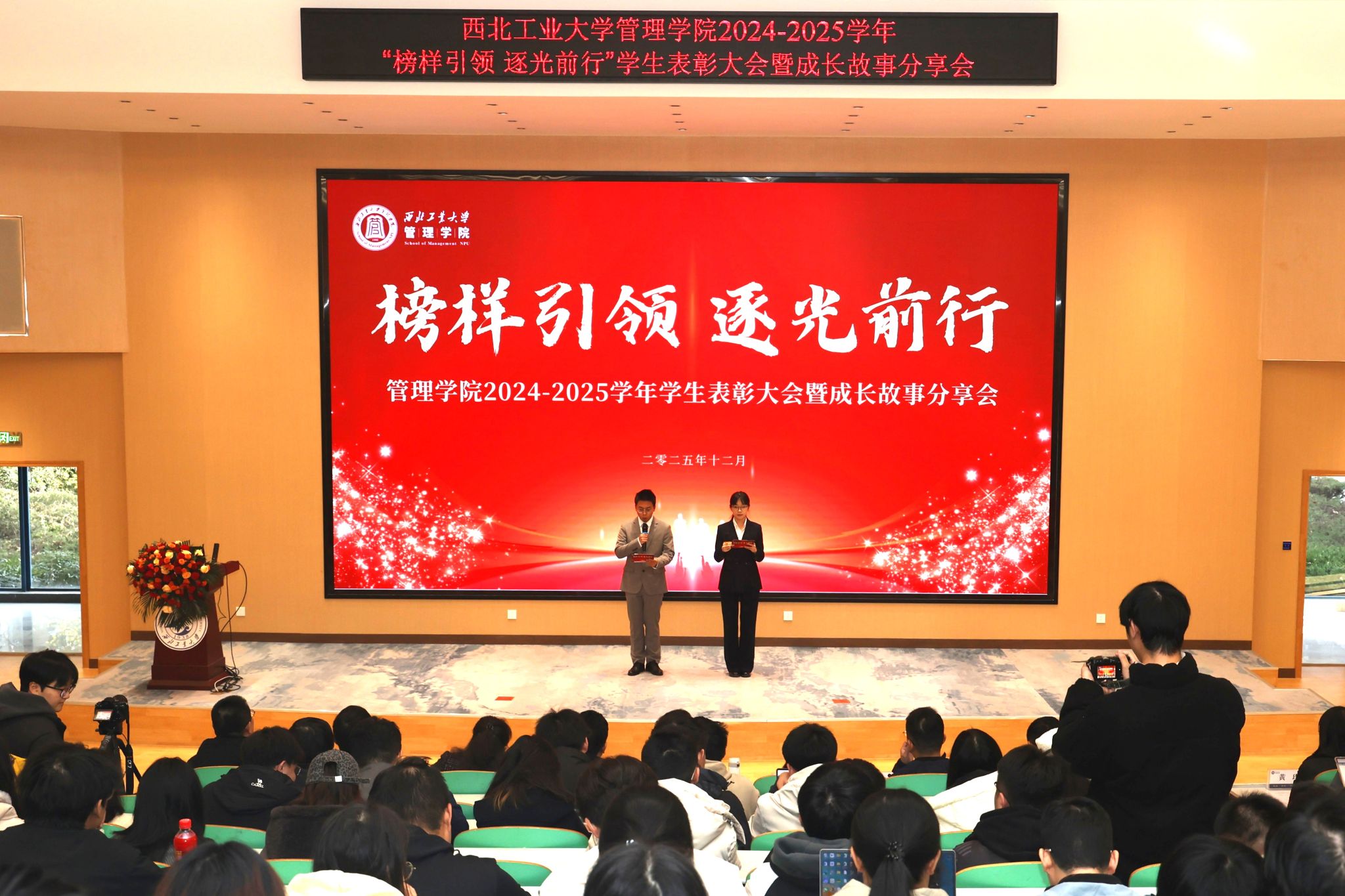 为表彰先进、选树榜样,营造积极向上、争先创优的育人氛围,12月18日下午,williamhill英国威廉希尔在长安校区教学西楼A100报告厅隆重举行2024-2025学年“榜样引领 逐光前行”员工表彰大会暨成长故事分享会,共同见证荣耀时刻、分享成长收获。公司党委员工工作部部长、员工处处长于辉,管理公司党委书记张爽、经理车阿大、副经理陈琳、副书记王海啸、经理助理李乘龙、班主任代表、全体学工干部、受表彰的先进集体和优秀员工代表、各年级员工代表共同参加了大会。2024级硕士生王萌和2024级本科生邓炅杰共同主持本次活动。