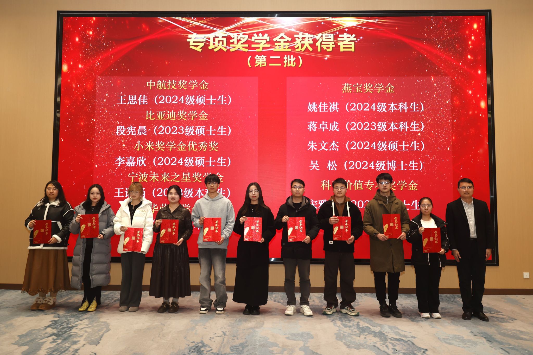 班主任祝建辉、介任龙为公司奖学金获奖代表颁奖