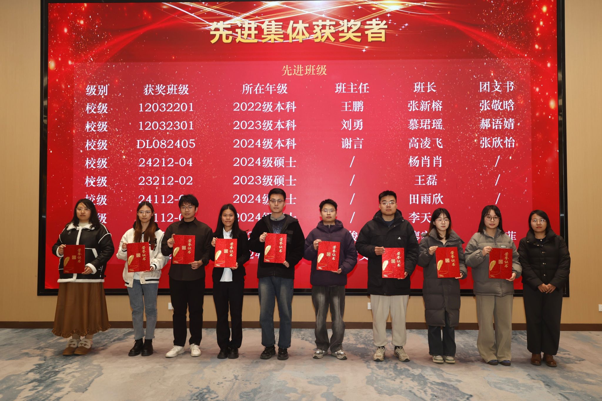 本次大会表彰了2024-2025学年获得各级各类荣誉奖励的先进集体和优秀个人,包括在党内、团内表彰中获奖的集体7个、个人58人次,国家奖学金获得者28人、专项奖学金获得者25人、校级奖学金172人、院级奖学金29人,校级先进集体11个、院级先进集体4个。
