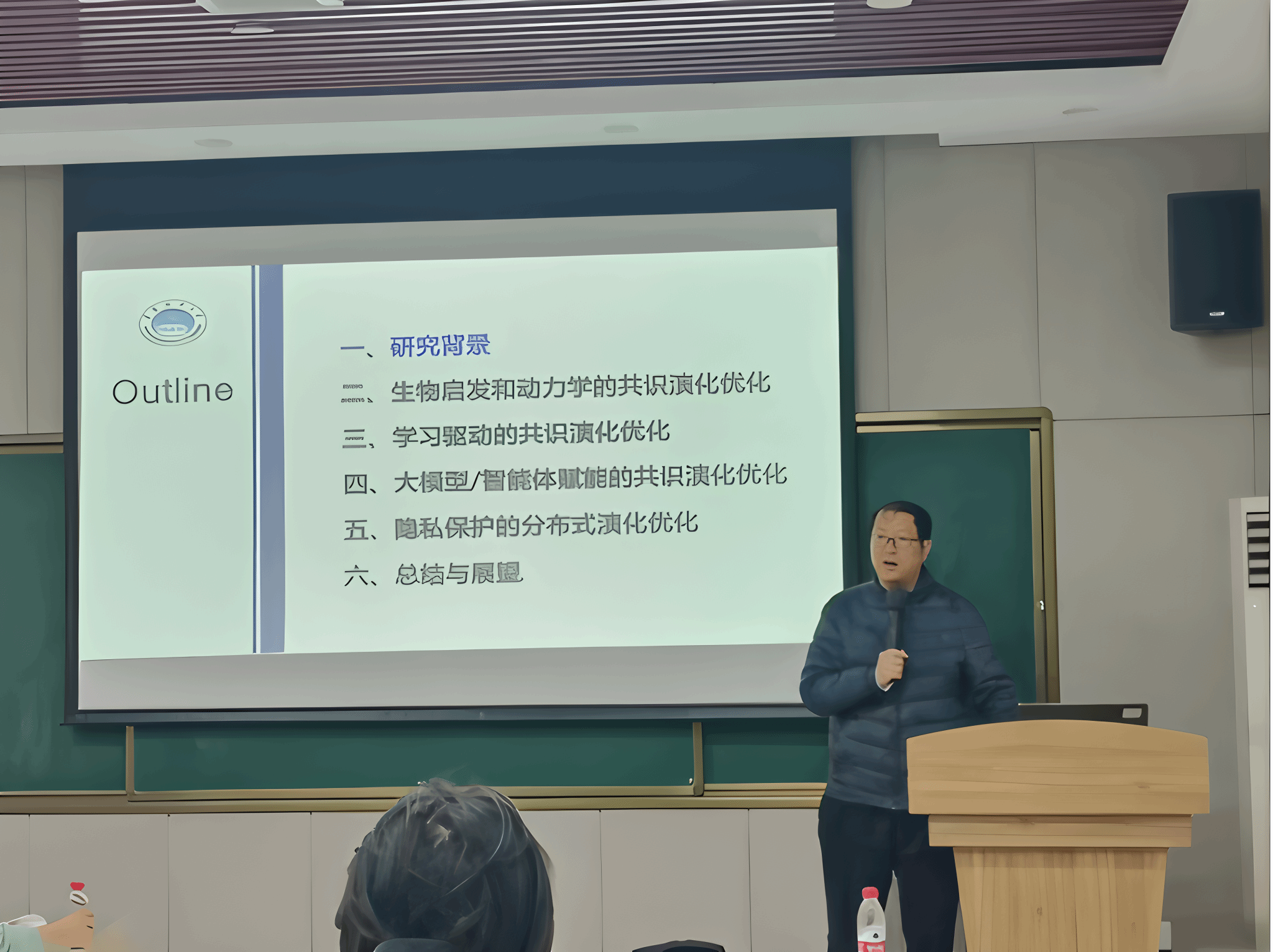 会议伊始,王阳教授对陈伟能教授的专业背景、科研成果做了简单介绍。williamhill英国威廉希尔师生对陈教授的到来表示了热烈的欢迎。此次报告会,陈教授介绍了面对实际应用中普遍存在的非凸、黑箱、高维等复杂优化场景,如何应对分布式环境下群体智能决策与优化所面临的挑战。首先,介绍了生物启发和动力学的共识演化优化、学习驱动的共识演化优化,对其中基于内外部学习的多智能体粒子群优化、强化学习辅助的共识演化优化等研究进行了详细讲述。其次,介绍了大模型/智能体赋能的共识演化优化、隐私保护的分布式演化优化,为师生展示了多角色LLM协作的Agent超启发式策略自主设计、面向组合优化的隐私保护遗传算法等研究。最后,陈教授对分布式进化计算进行了总结与展望。
