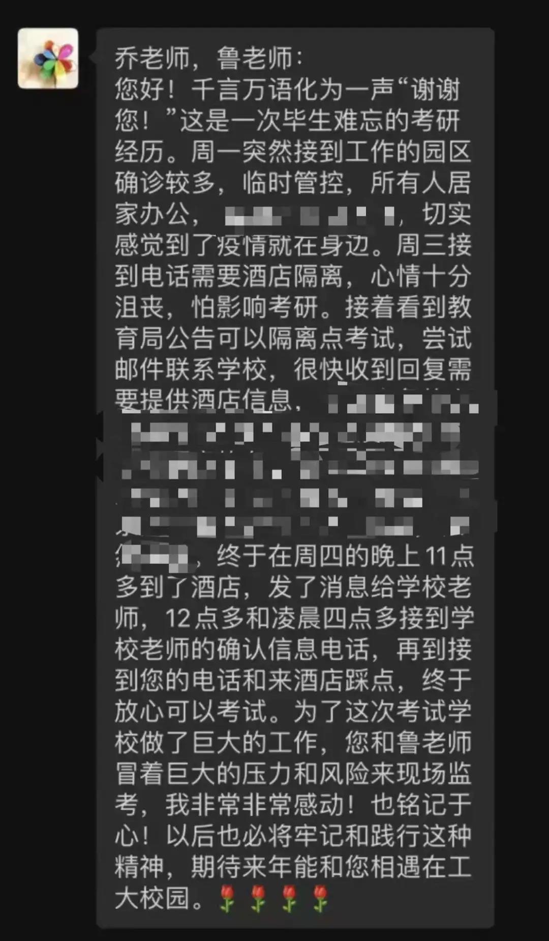 乔彩燕说:“当拉着行李箱走进酒店,我们就已做好就地隔离的准备,总要有人逆行,任务艰巨而光荣。我们既是监考,也是陪考,陪伴这批特殊的考生共克时艰是我们的使命。高校的根本任务是育人,公司对这次考研的细致安排就是最好的教育,当考生小杨考完临走时给我们深深鞠了一躬,当收到她真挚的感谢信息,我们感到所有的付出都值得。还有一大批奋战在一线的同事们为这次特殊的考研默默付出,我以他们为荣,我以西工大为荣。这两天下雪降温了,但这个飞雪的冬日很温暖。”