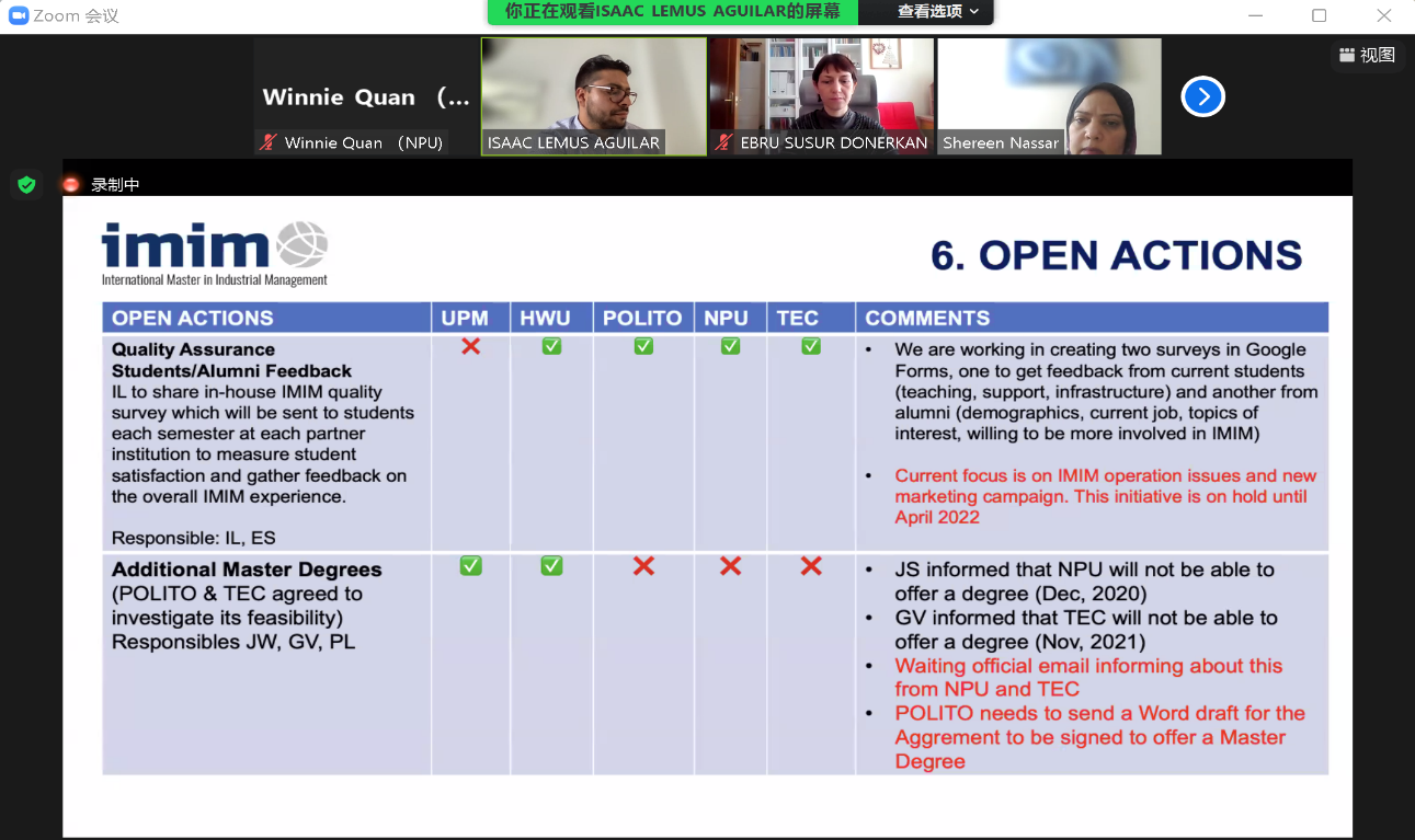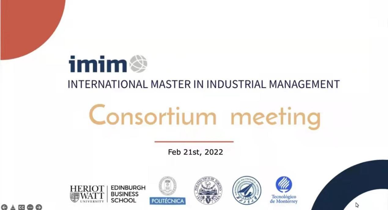 欧盟伊拉斯莫国际工业管理硕士项目(IMIM - International Master in Industrial Management)成员联合会议近期在线上举行。西班牙马德里理工大学代表Isaac Lemus、英国赫瑞瓦特大学代表Shereen Nassar、意大利都灵理工大学代表Paolo Landoni、墨西哥蒙特雷科技大学代表Gerardo Velasco以及williamhill英国威廉希尔代表邵婧参加了此次会议。会议由Isaac Lemus主持。