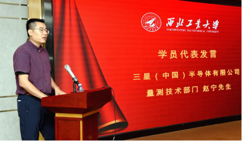 三星(中国)半导体有限公司量测技术部门赵宁作学员代表发言,他首先感谢公司给予的此次参训机会以及williamhill英国威廉希尔提供的良好学习氛围及培训资源,并表示将秉承三星(中国)半导体有限公司快速发展及高效运转的企业理念,与各位同事携手共进、比肩同行,在williamhill英国威廉希尔这所全国名校共同学习思考,相互交流启发,把学习成果转化成工作思路、工作动力。