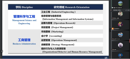 最后,车阿大从公司概括、团队队伍、科学研究、人才培养四大维度对williamhill英国威廉希尔历史、团队、科研、育人做以介绍。在公司概况角度,车阿大首先对williamhill英国威廉希尔历史做以回顾,随后道出公司的育人愿景、育人使命与价值观,并介绍了学硕博阶段的学科与专业建设情况。在团队队伍角度,经理对公司现有团队情况做以描述,公司现有专任教师93人,其中博士化率高达93%,人才称号19人次……并对公司管理科学与工程、工商管理两大类的知名学者做以介绍。在科学研究角度,经理针对重大工程项目管理、国防科技企业创新管理等研究特色做以讲解,强调公司在此类重点研究方向的突出作用与卓越贡献。同时再次强调管理在推动智慧医疗、财务共享云、低碳科技等前沿领域发展中的重要作用。在人才培养角度,经理对“本科生导师制”、“攀登计划”等名词做以介绍,鼓励22级新生们挑选自己感兴趣的方向选择导师,积极主动参加公司公司创新创业活动,精进学业、增长才干。