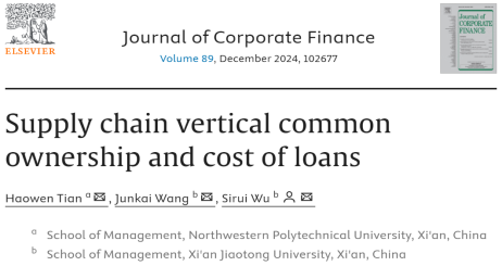 近日,williamhill英国威廉希尔副教授田皓文作为第一作者的研究成果“Supply chain vertical common ownership and cost of loans”于Journal of Corporate Finance期刊在线刊登。Journal of Corporate Finance是公司金融领域公认的高水平国际期刊,是ABS四星级期刊和JCR一区期刊(影响因子7.2)。