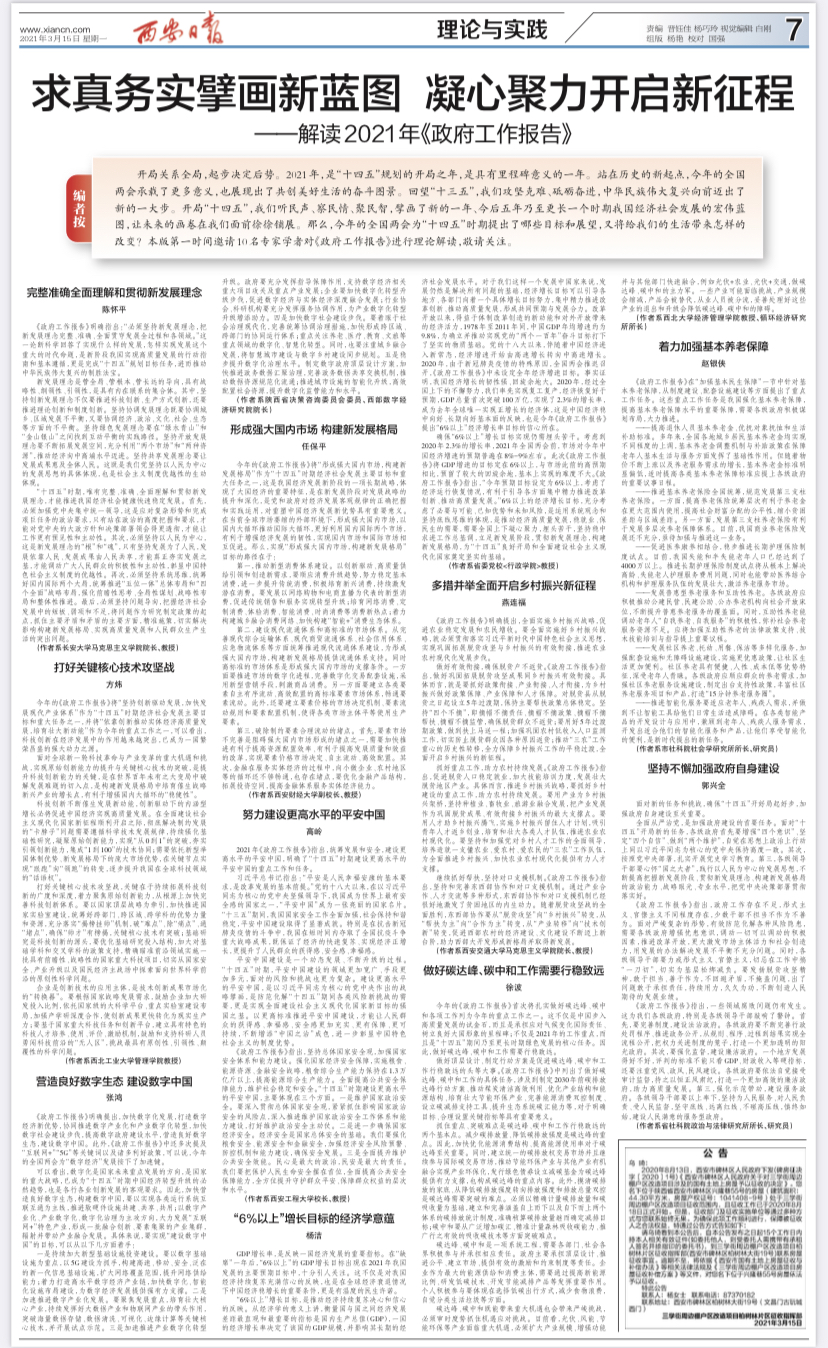 3月15日,《西安日报》第7版理论与实践“解读2021年《政府工作报告》专栏”刊发了williamhill英国威廉希尔方炜教授撰写的理论文章《打好关键核心技术攻坚战》。
