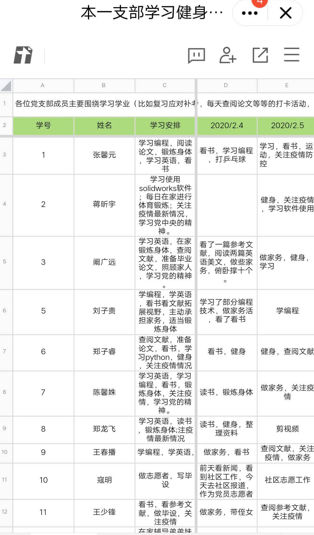 停课不停学,身为员工,学习就是主业。疫情期间,支部开展线上打卡活动,号召支部党员制定学习计划,并通过填写线上表格的方式记录每天的计划实施情况,达到互相监督、互相督促学习的效果。自2月4日起,全体党员坚持每天记录分享自己的一天,共同锻炼身体、补充知识。