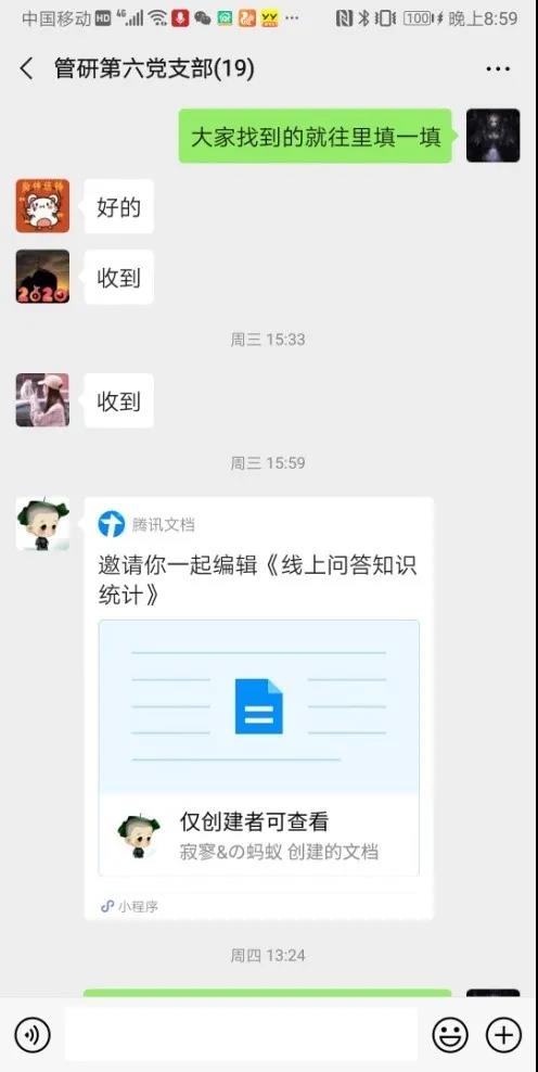 支部纪律委员张旭同学提出,他正在负责组织公司团委进行“背水‘疫’战”线上答题活动,正好将支部活动与其结合起来,进行一次党团合作。前期支部同学积极学习有关防疫知识,并进行具体知识点的总结,进行汇总形成防疫知识点资料库,为公司团委的线上答题题库提供参考。后期支部成员积极参与线上答题活动,也是检验自身学习成果的好机会。