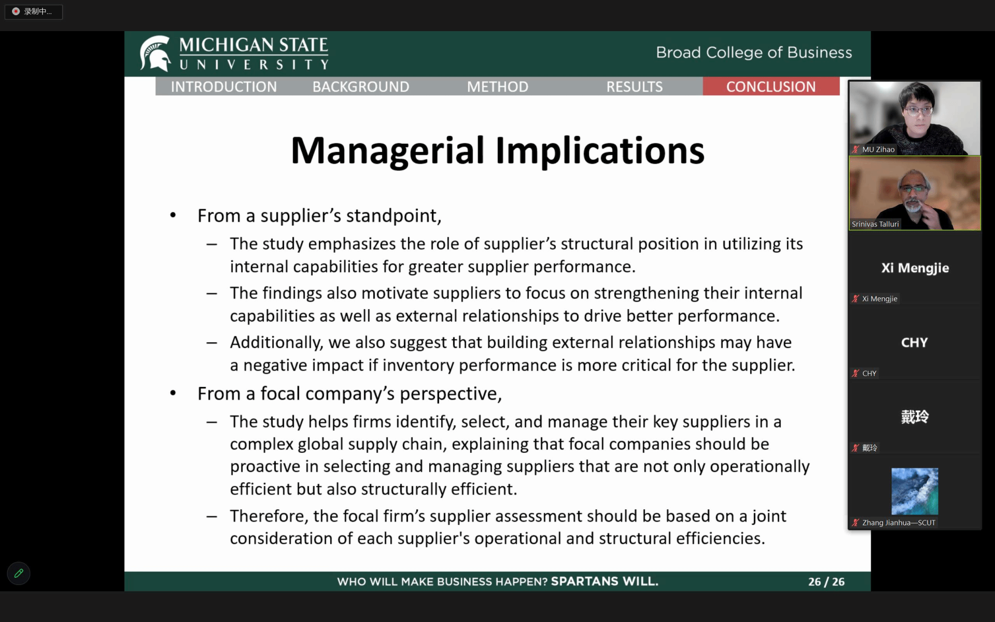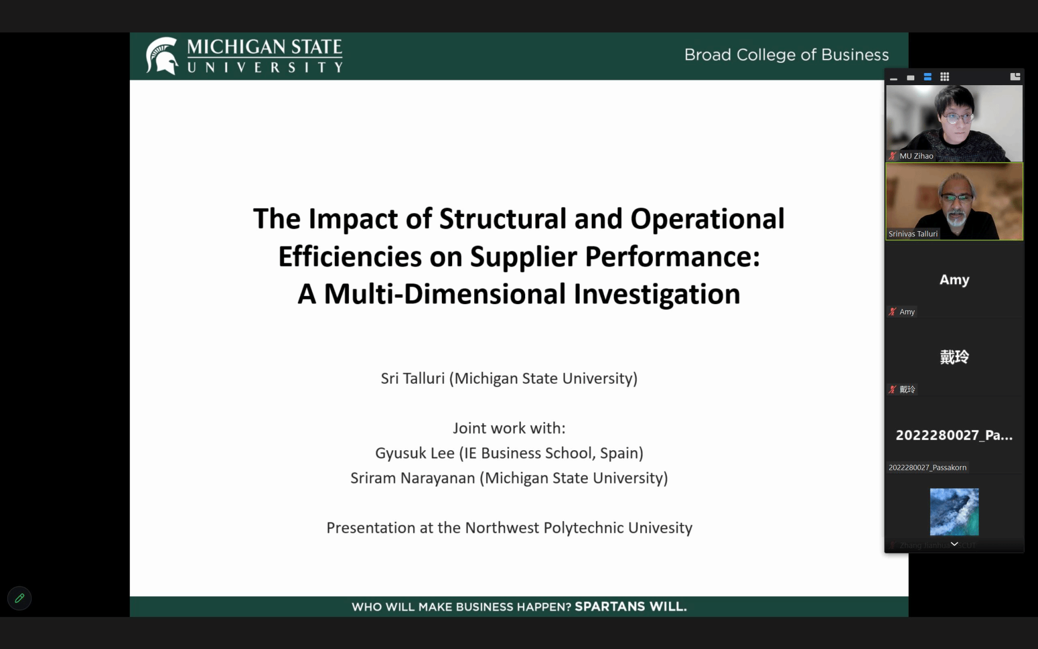2023年10月23日下午,应williamhill英国威廉希尔邀请,美国密歇根州立大学(Michigan State University)Eli Broad商公司讲席教授Srinivas (Sri) Talluri以线上报告会的形式和公司师生开展学术交流,作题为“制造和结构效率对供应商的影响:一种多维调查方法”(The Impact of Manufacturing and Structural Efficiencies on Supplier Performance: A Multidimensional Investigation)的学术报告。本次报告会由牟梓豪副教授主持,williamhill英国威廉希尔教师和研究生参加了此次报告会。