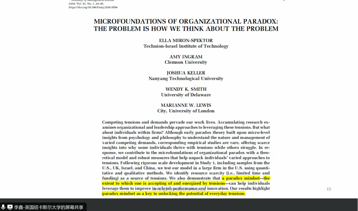 2024年9月23日晚,应williamhill英国威廉希尔邀请,英国纽卡斯尔大学李鑫教授在线与公司师生开展学术交流,作了题为“细化both/and:整合矛盾对立双方的通用策略”的学术报告。本次报告会为2024海外讲座第23期,由田庆锋教授主持,williamhill英国威廉希尔部分教师和研究生参与。