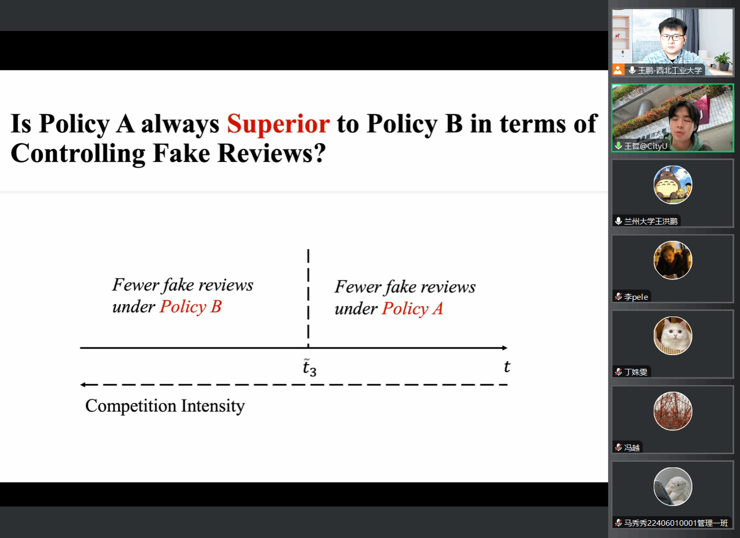 此次讲座报告中,王哲聚焦在线评论系统中的虚假评论问题,特别是在电商领域的治理策略,探讨了相关激励机制和政策的设计,同时评估了人工智能在识别、减少虚假评论中的潜力及其对消费者行为和平台声誉的影响。此外,王哲强调了基于产品特性与市场竞争状况调整平台政策的必要性,以及这些策略对消费者福利与社会福利的潜在影响。