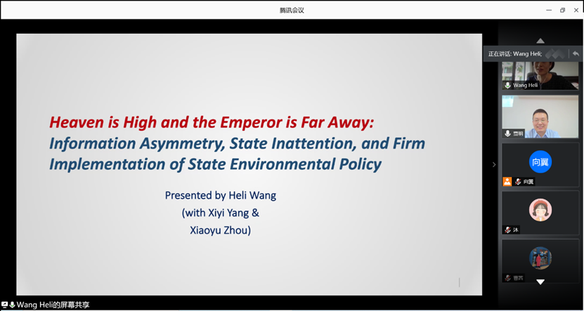 2020年8月10日下午,应williamhill英国威廉希尔贾明教授邀请,新加坡管理大学王鹤丽教授通过腾讯会议平台为公司做了题为“Heaven is High and the Emperor is Far Away: Information Asymmetry, State Inattention, and Firm Implementation of State Environmental Policy”的学术报告。本次报告由贾明教授主持,公司师生共100余人参与了此次报告。