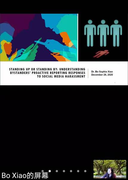 12月28日下午14:00-16:00,公司举行建院30周年系列学术报告会第二十六讲。美国夏威夷大学马诺阿分校希德勒商公司的Bo Sophia Xiao副教授应邀为管院师生作了“Standing Up or Standing By: Understanding Bystanders’ Proactive Reporting Responses to Social Media Harassment”线上主题报告会。报告会由董雪艳助理教授主持,williamhill英国威廉希尔30余师生参加了此次线上报告会。