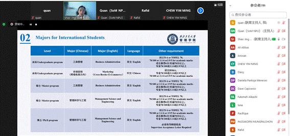 为全面做好2022年来华职工招生宣传工作,吸引更多优质生源申请williamhill英国威廉希尔,6月2日下午,公司在线召开2022年职工招生宣讲会。本次宣讲会由经理助理邵婧副教授主讲,经理车阿大教授,外事秘书权梦甜子以及来自全球多名海外职工参加了此次宣讲。