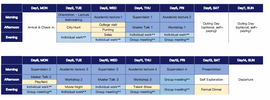 为期2周密集型导师制学术科研项目的关键部分是培养科研能力。在剑桥大学导师和助教的指导下,进行所选学科方向的深入学习和研究,接触这一学科领域最新的知识、最前端的创新和研究成果。学习者将通过剑桥大学教授提供的互动讲座/活动,以及剑桥大学博士生助教带头的小组辅导,培养对该学科的兴趣,提高科研能力。学习者将通过剑桥大学下属机构组织提供的工作坊,提升学术软实力和职业竞争力。学习者将以小组的形式开展各种类型的学习和科研项目,并在最终学术汇报上发表研究报告/演讲。课程收获:公司邀请函、结业证书、成绩报告、项目学分(具体学分由校方根据成绩评估)