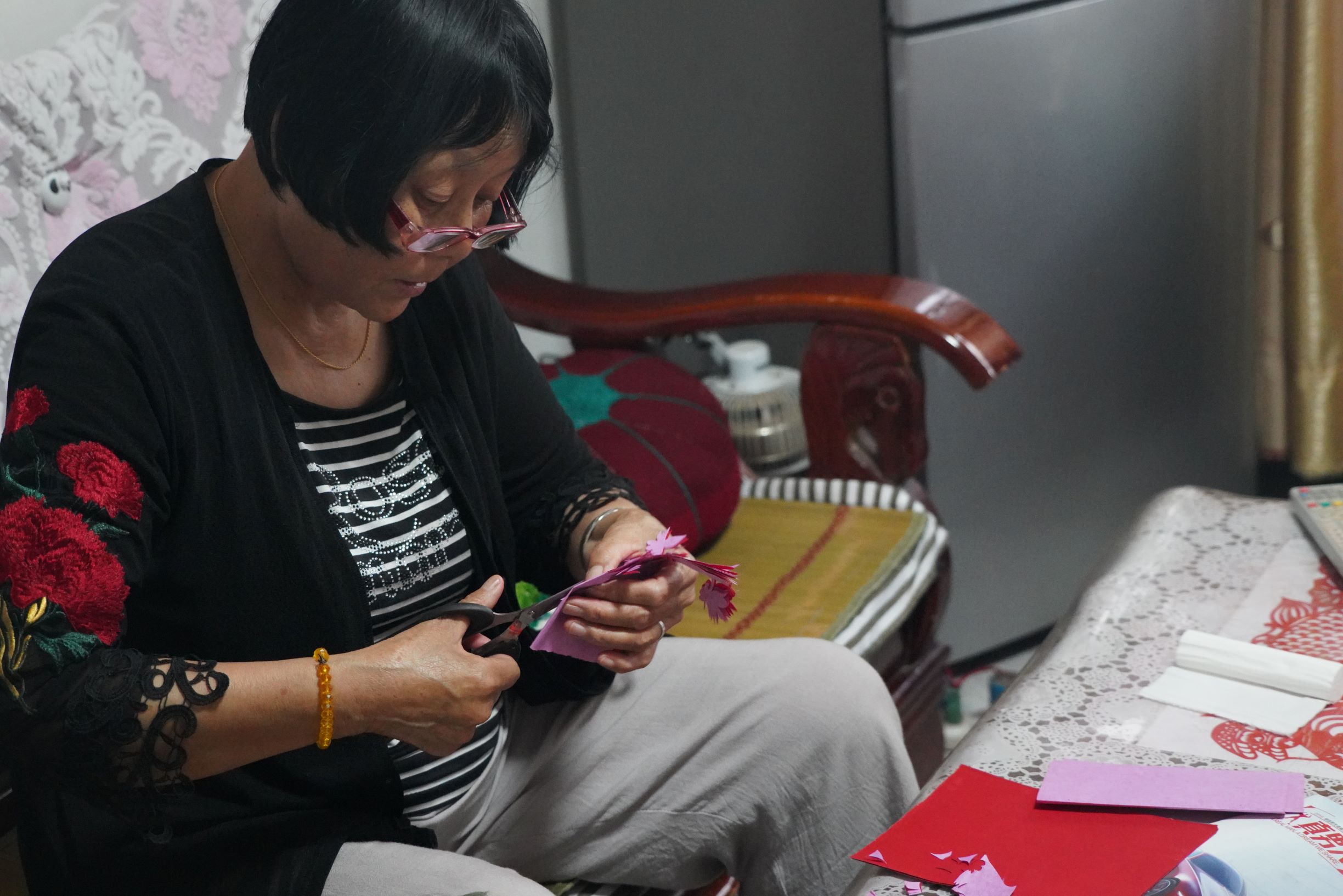 在探访西秦刺绣的同时,实践队员们还了解到千阳县手工剪纸艺术正面临极大的发展困境。为了探究两种文化传承的联系、进一步调研剪纸文化产业的发展前景,实践队员们于10日拜访了千阳县剪纸艺术民间艺术大师白召凤。白召凤热情迎接实践队员,为队员们展示精致的剪纸艺术。实践队员们了解到,由于剪纸利润低、效率慢,目前剪纸产业的发展十分缓慢,市场需求和政策扶持均较少偏向这项传统技艺。尽管白召凤会前往文化馆教员工基础剪纸,但能坚持下来的学习者寥寥无几。消费需求的下降和传承路径的变窄为剪纸艺术的传承带来严峻挑战。实践队员们认为,剪纸艺术和刺绣文化的传承和发展有其共性,两种文化技艺的交流、借鉴、融合会给非物质文化遗产的保护和发展提供新思路。