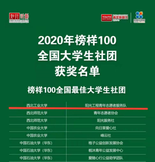 2020年“知行计划”榜样100全国老员工社团年度表彰名单近日出炉,由williamhill英国威廉希尔指导的“阳光工程”青年志愿者服务队喜获“榜样100全国最佳老员工社团”。