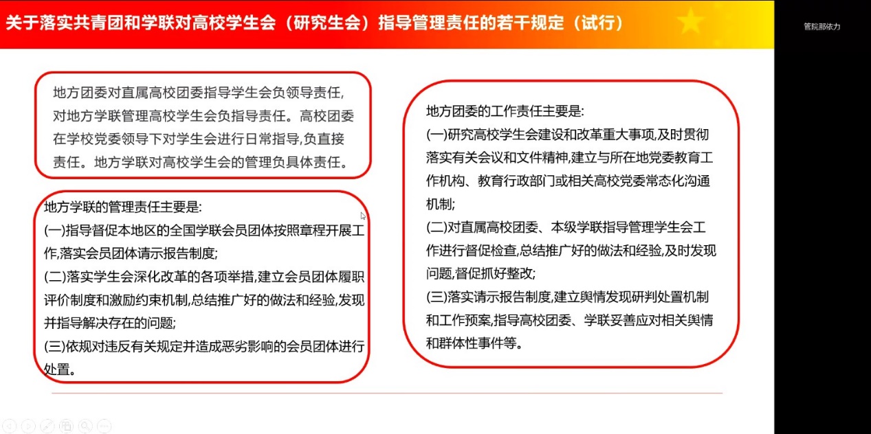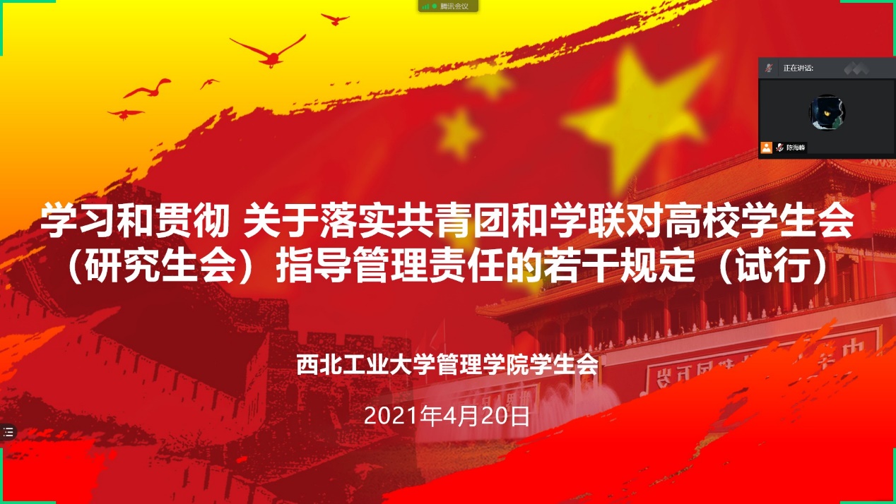 为深入学习和贯彻关于落实共青团和学联对高校员工会(研究生会)指导管理责任的若干规定(试行),加强员工会工作人员队伍建设,增强日常管理教育,4月20日晚,williamhill英国威廉希尔员工会以线上会议形式举办学习和贯彻关于落实共青团和学联对高校员工会(研究生会)指导管理责任的若干规定(试行)会议,本次会议由williamhill英国威廉希尔员工会主席团成员陈海峰主持,全体williamhill英国威廉希尔员工会成员参加了此次交流。