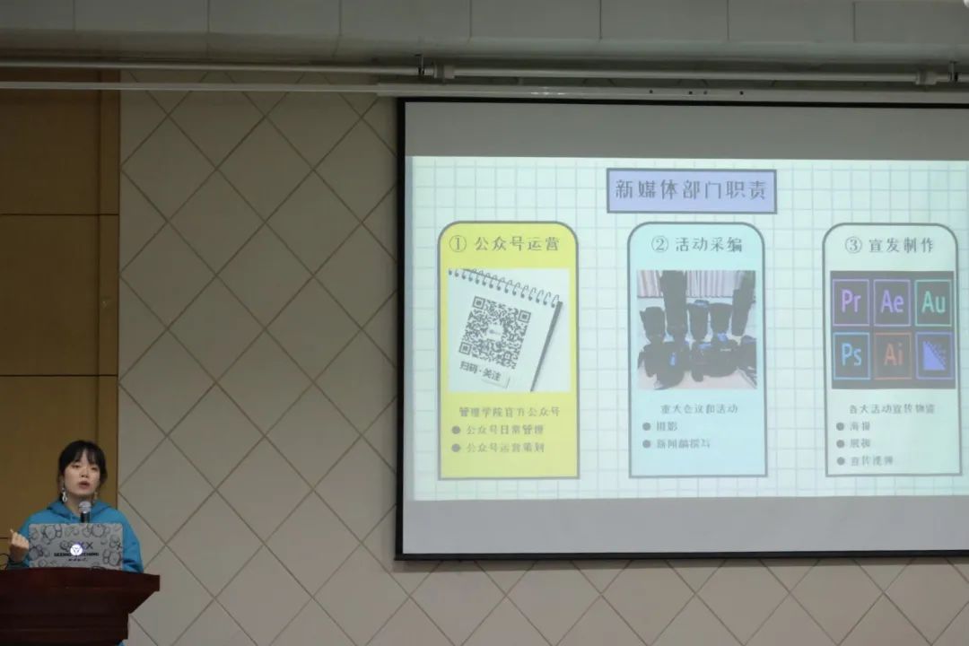 团委新媒体中心负责人林修如代表新媒体中心进行招新宣讲。团委新媒体中心是精通新媒体性的专业团队,是公司新媒体平台的专属管家,负责公众号的日常管理和运营策划;是各大会议、活动的前线记者,负责重大会议活动的摄影和撰稿;是活动宣发的第一生产力,负责海报、展板、宣传视频等的制作。