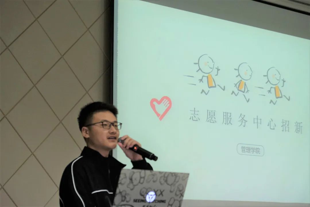 团委志愿服务中心负责人朱文杰代表志愿服务中心进行招新宣讲。宣讲伊始,朱文杰同学先通过一段有趣的视频吸引了同学们的兴趣,也让同学们初步认识了志愿服务中心。志愿服务中心旨在培养员工的劳动实践能力,把“奉献、友爱、互助、进步”的志愿者精神嵌入在志愿活动中,是老员工参与社会实践活动的重要平台。