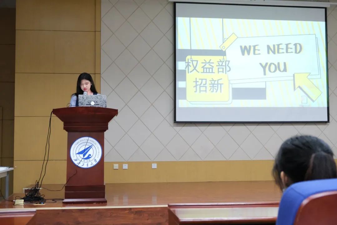 员工会权益部负责人张宝怡代表权益部进行了招新宣讲。员工会权益部是帮助公司同学反馈问题、解决问题的机构,是以服务广老员工为原则、维护广老员工权益为宗旨、是与广老员工切身利益联系最为密切的部门,包括脱口秀大会、生存福利、问题信箱、与领导们的“茶话会”等部门特色活动。权益部现任负责人分别为张宝怡、张敬昱、赵艳蓉。