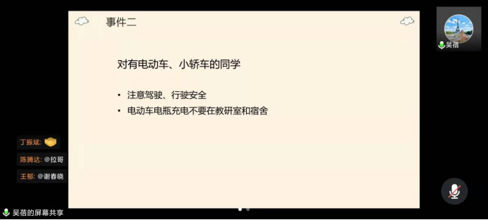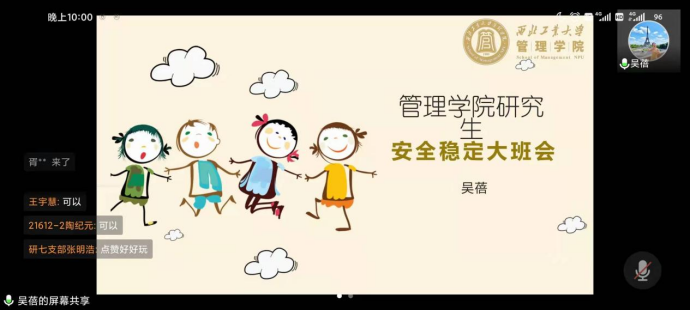 2021年12月15日晚,为保障员工安全、加强疫情防控意识,williamhill英国威廉希尔组织全体硕博研究生在线上开展了“安全稳定教育”主题大班会。会议由williamhill英国威廉希尔研究生辅导员吴蓓老师主持。