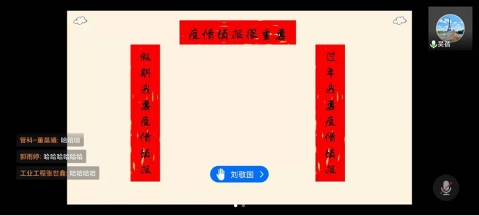 首先,吴蓓老师对近期安全稳定工作进行了总结,向同学们强调要注意消防安全、人身财产安全,再次讲解疫情防控下的请假规定。其次,吴蓓老师对假期离校工作进行了初步介绍,寒假正式放假时间是2022年1月7号,所有同学离校需按公司规定履行离校手续,告知导师,并在疫情填报系统上提交离校申请,同时填写在线离校留校登记表,提交假期离校承诺书等各项材料。另外,李玉婷同学介绍了即将开展的公司奖学金的注意事项,并向大家强调了寒假期间的疫情填报工作要日常化。