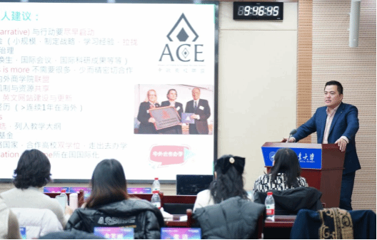 12月16日,沈伟教授分享了《商公司国际化》的主题。沈教授长期致力于教学国际化与商科国际认证领域,本次研讨会他分享了商公司国际认证的价值和EQUIS国际认证的相关经验,结合迪肯大学国际化战略的案例,涉及多元的国际员工计划、全球互联教育模式、鼓励毕业生全球思维等方面。